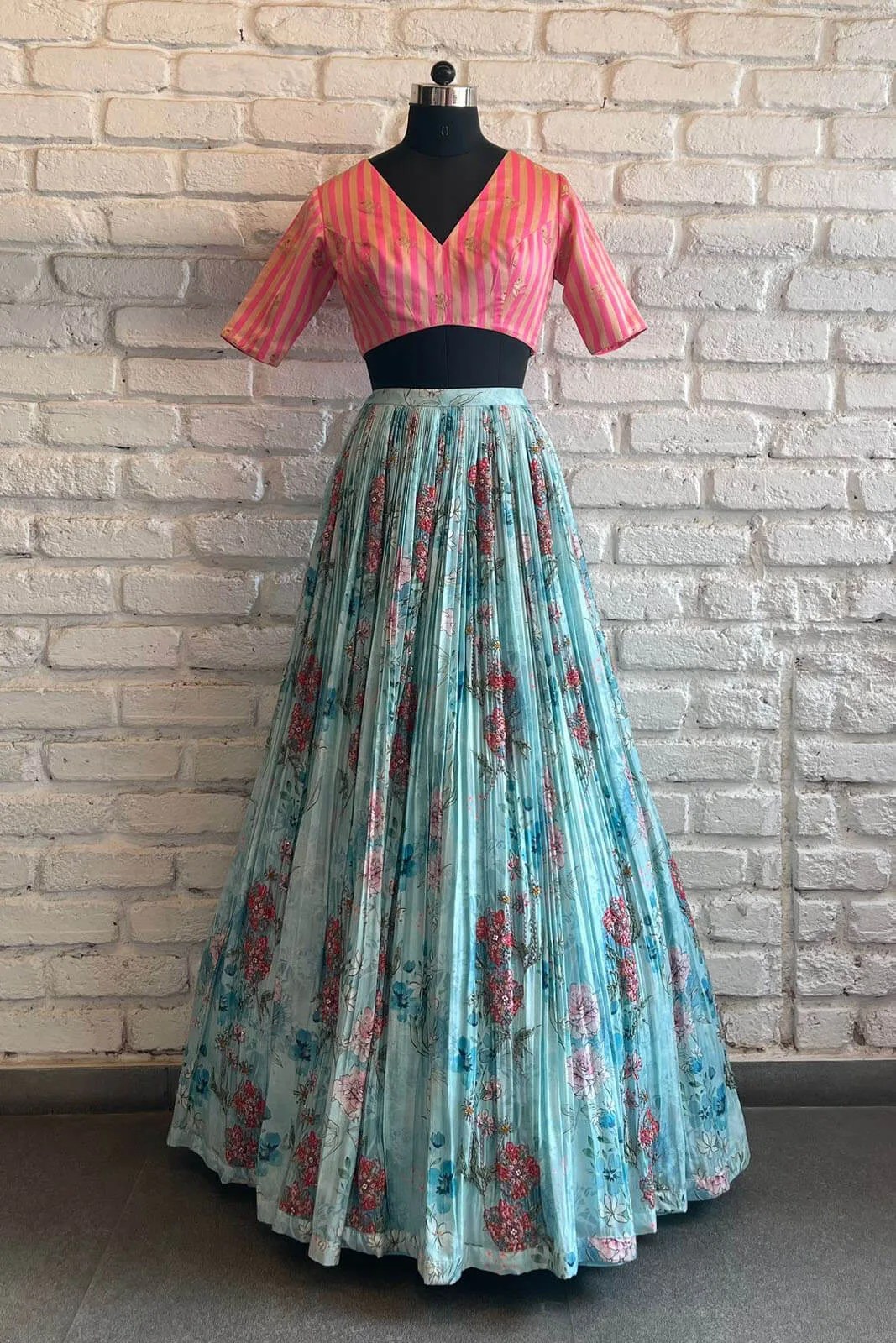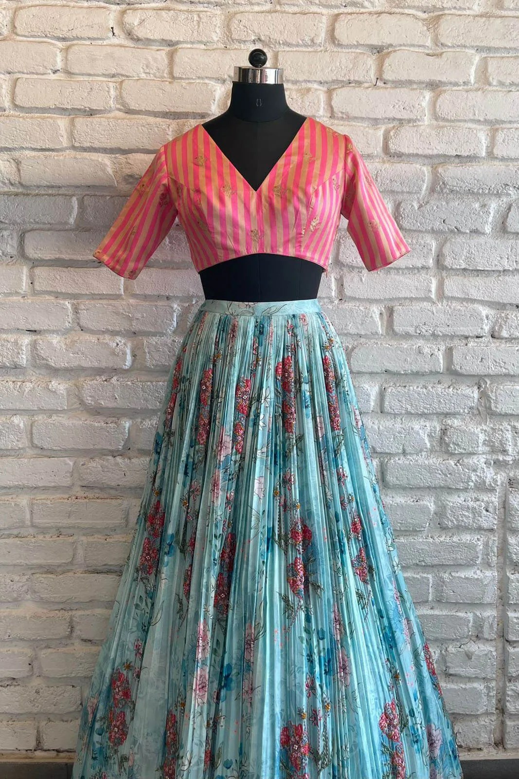 Pink stripe crop top paired with a blue printed highlighted skirt