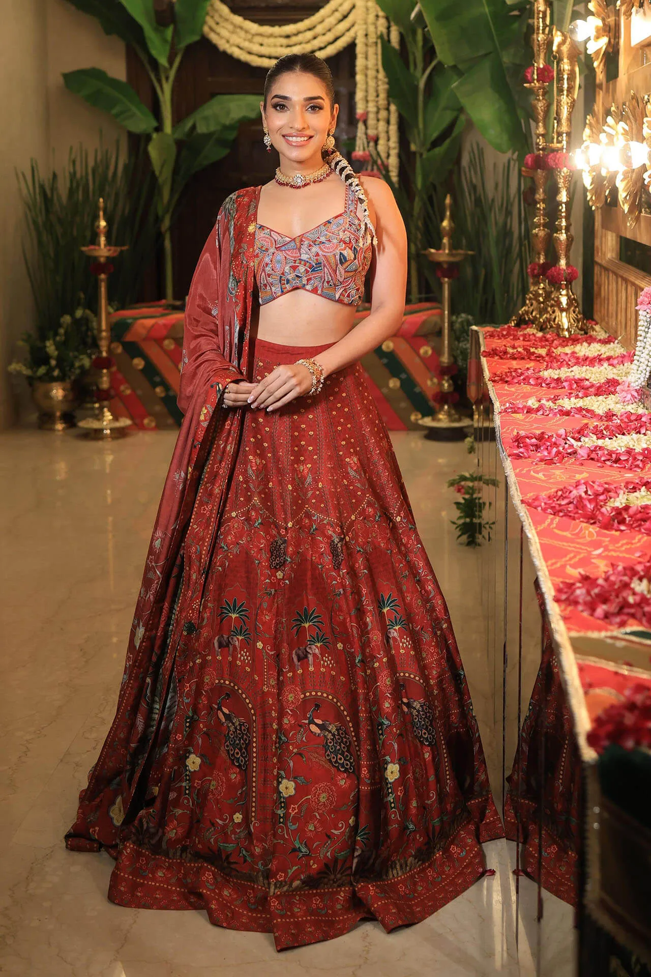 | Elements | Festive Lehenga, Fresh Red Print, detailing botanical print, hand embroidered threadwork bustier. |